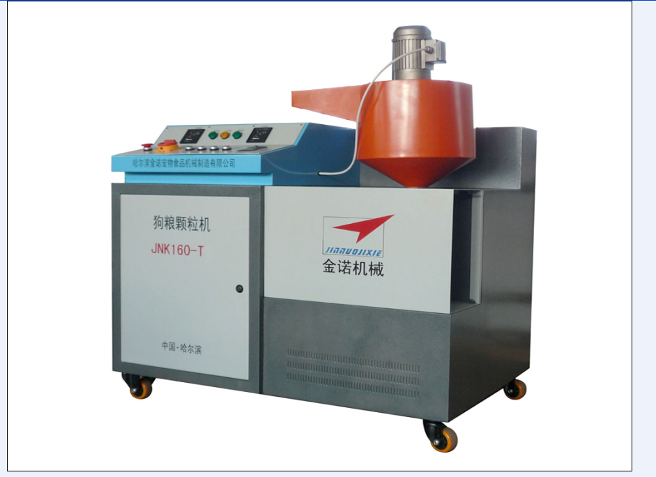 狗糧加工設備JNK200-T5M:1。JNK200-T5M型狗糧加工設備安裝方便、出廠已經試機,狗糧機切刀采用直角切刀技術,調試簡單;2。狗糧設備的主軸和切刀小軸均可隨時注入耐高溫潤滑脂,延長狗糧機的軸承使用壽命;3。JNK200-T5M狗糧設備每小時生產狗糧顆粒200公斤。